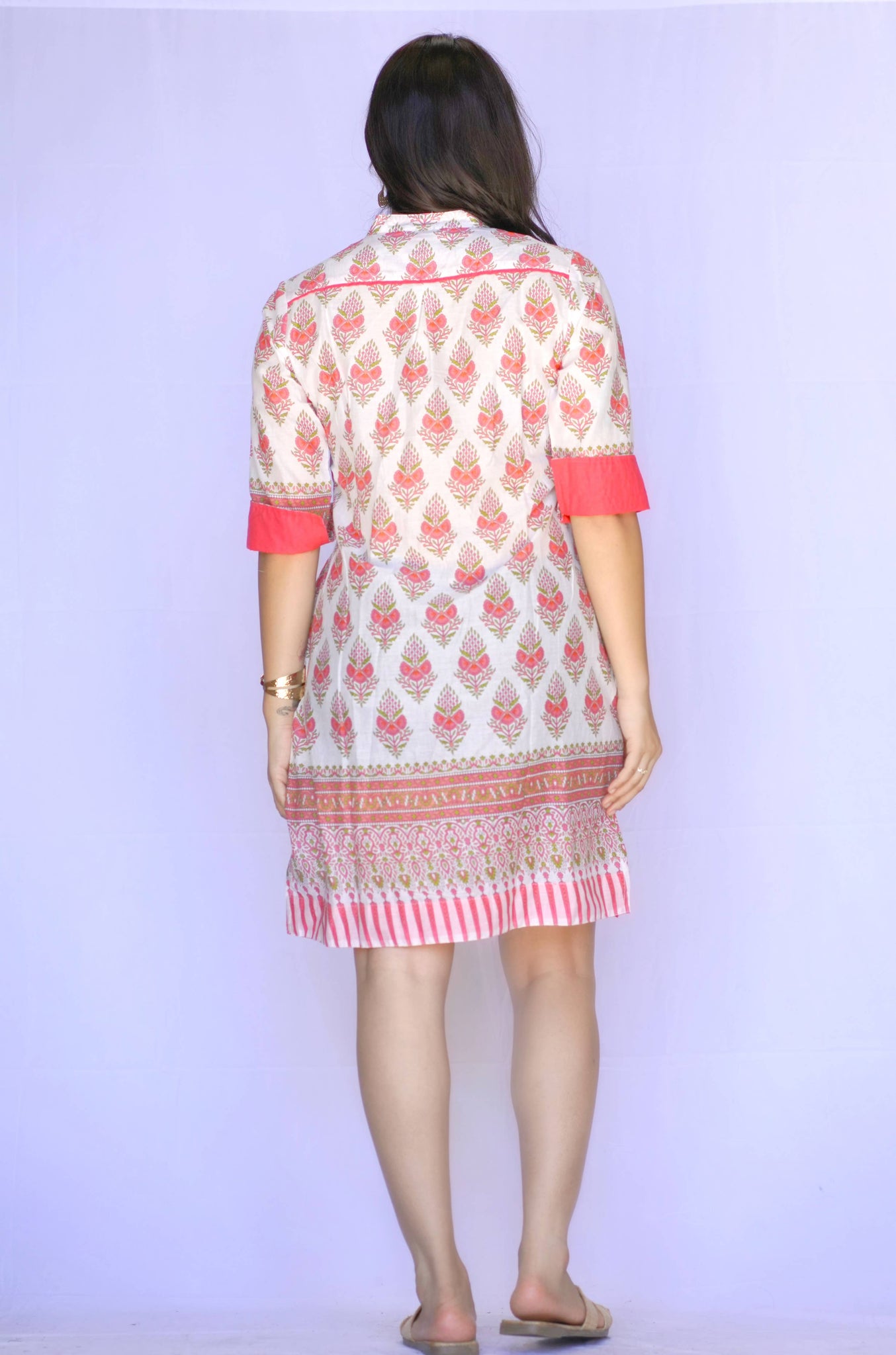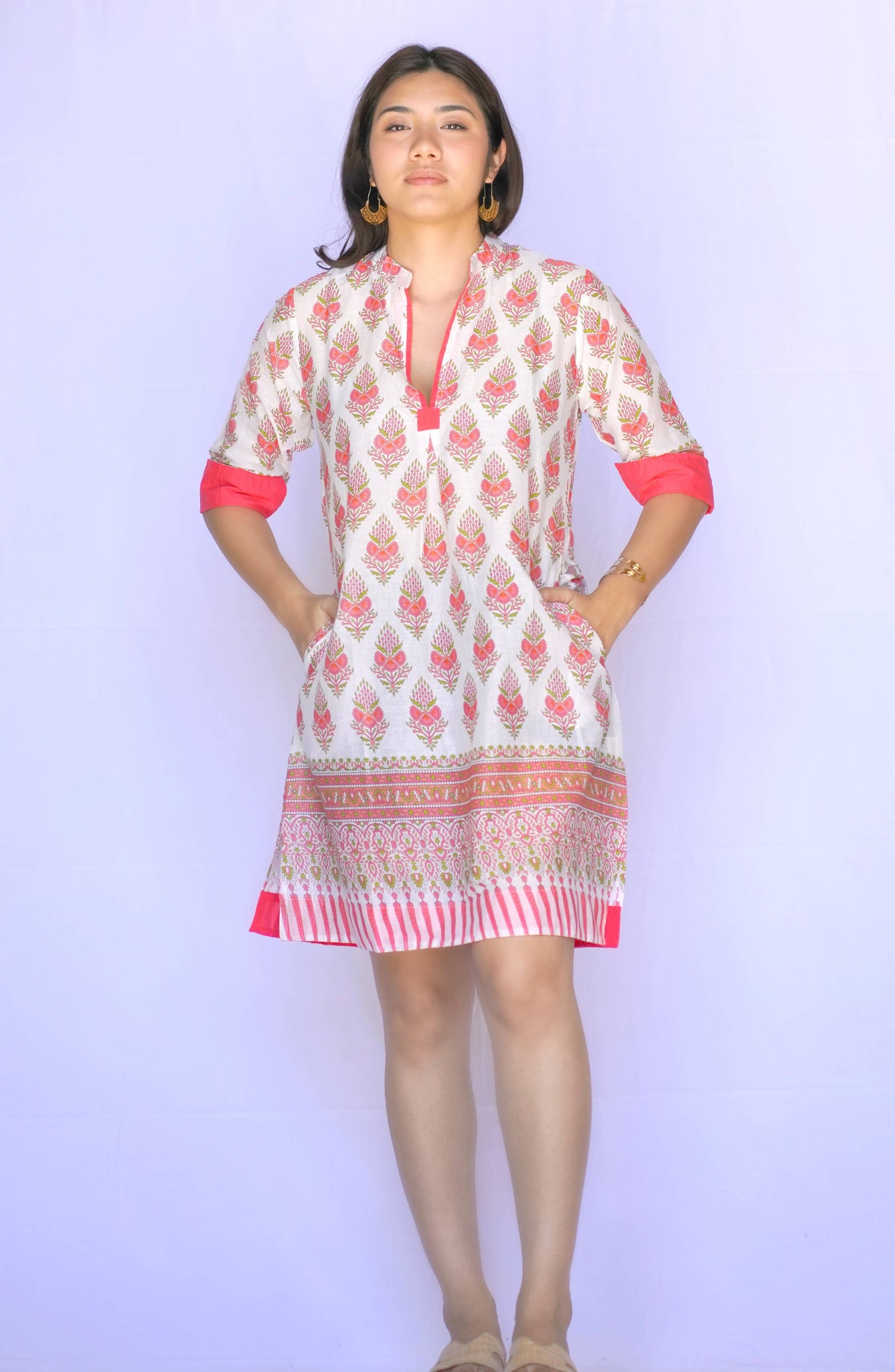 Perfect for a spring or summer day , the Amelia dress is a lightweight cotton tunic style with a contrasting cuff sleeve and hemline. The neckline features a flattering deep v with contrasting detail trim.