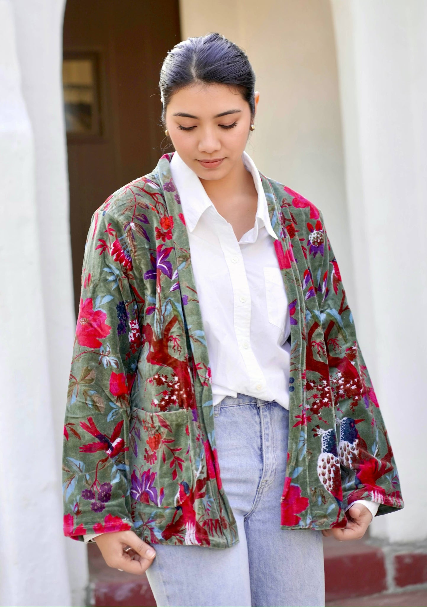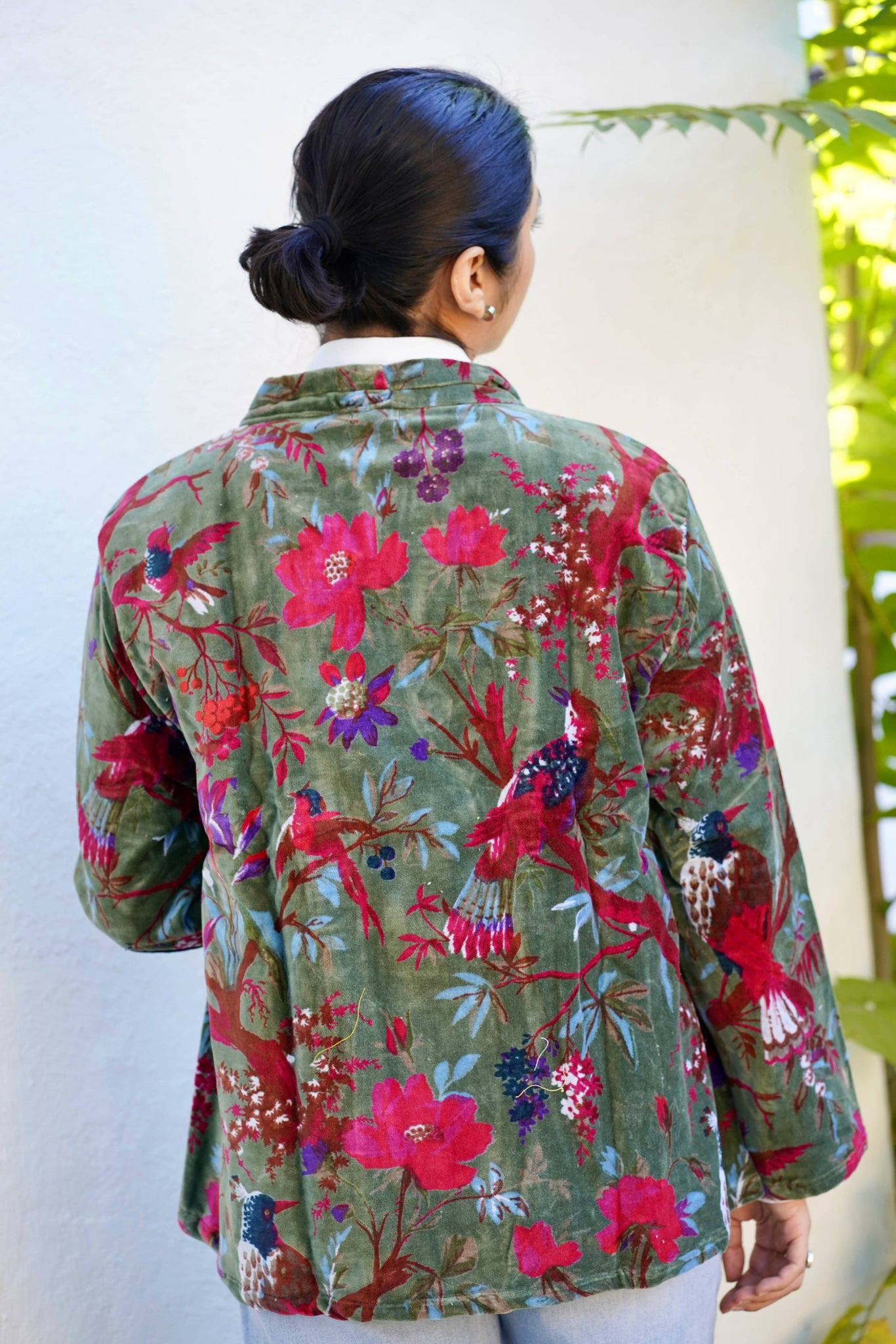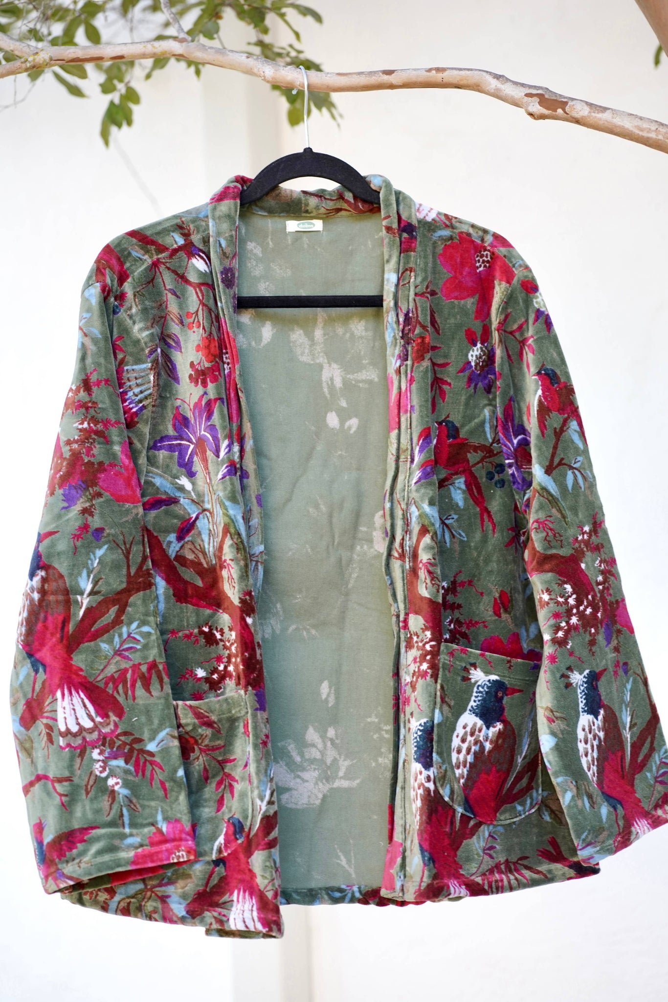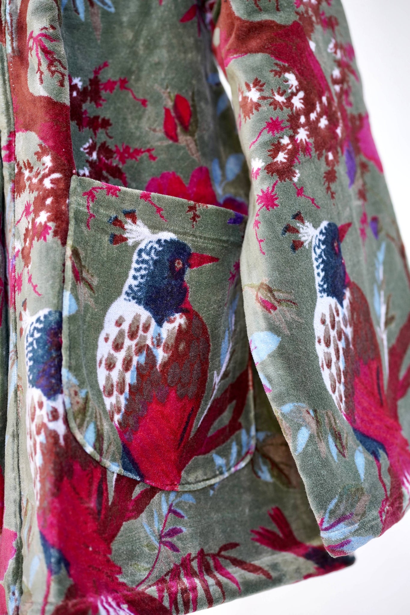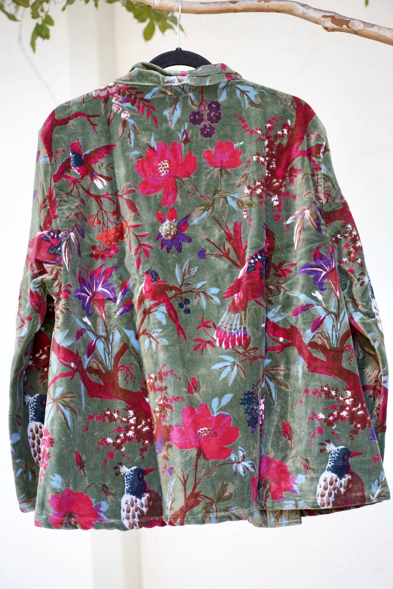 Elevate your wardrobe with our stylish Astrid Velvet Jacket. This beautiful layering jacket is printed with birds and flowers, which add a unique and bold touch to any outfit. Crafted from luxurious velvet, it is soft and lined, and can be worn dressed up or down.