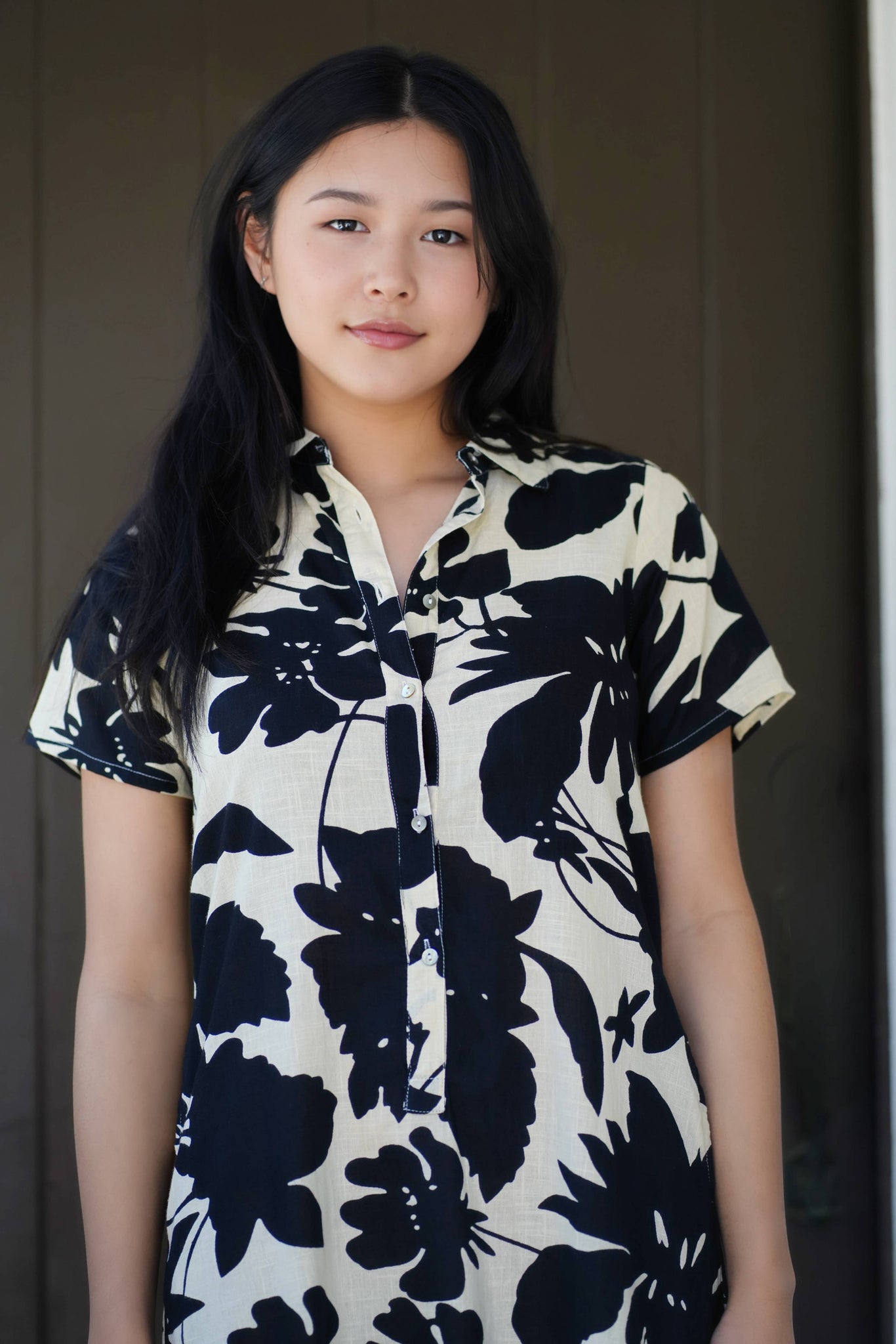 The Carrie Dress is a breathable and lightweight pullover dress in an abstract leaf print.
