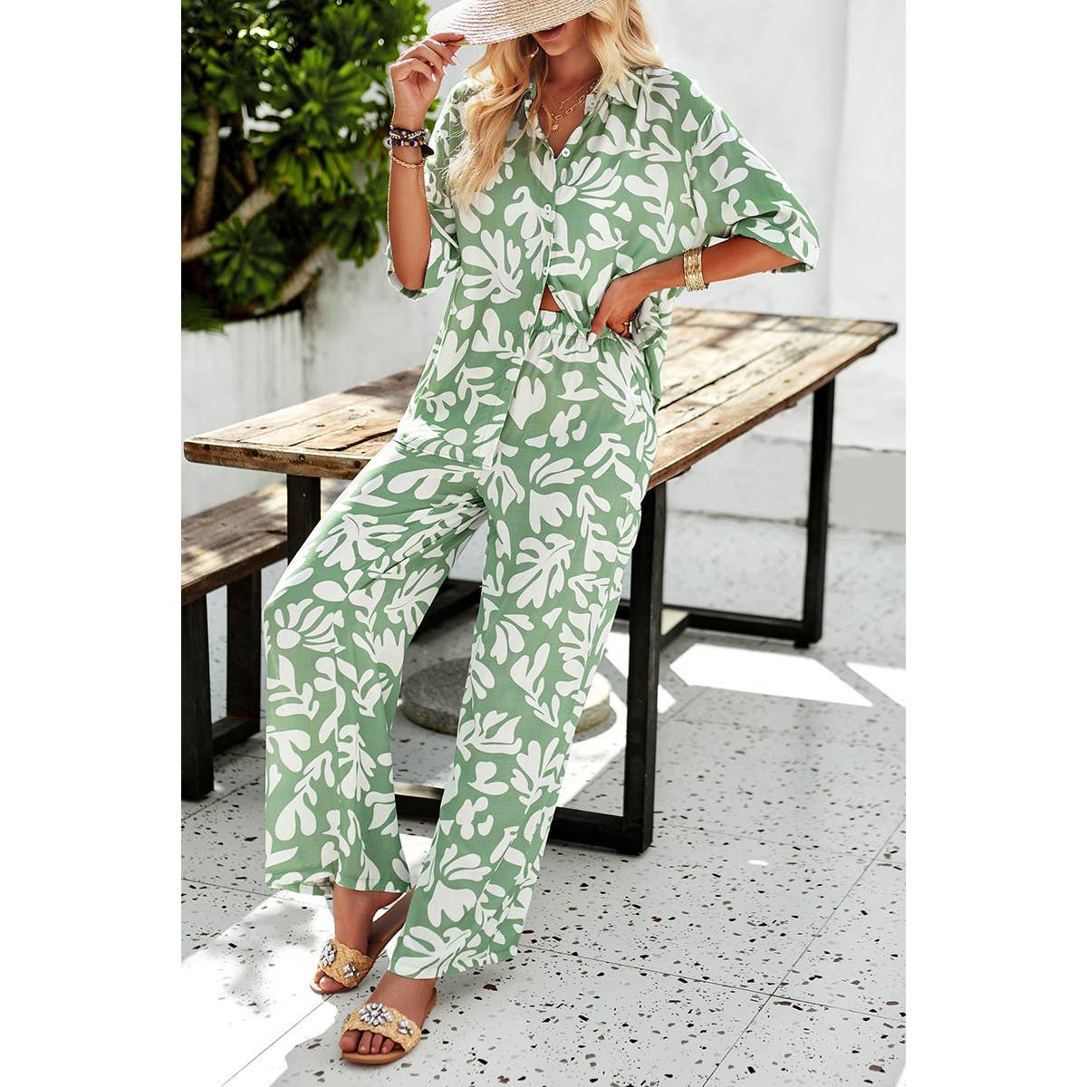 Material: 100% Viscose Features: Casual Allover Print Elastic Button Blouse Sets Occasion: Casual/Daily/Outdoor/Vacation/School/Going Out.