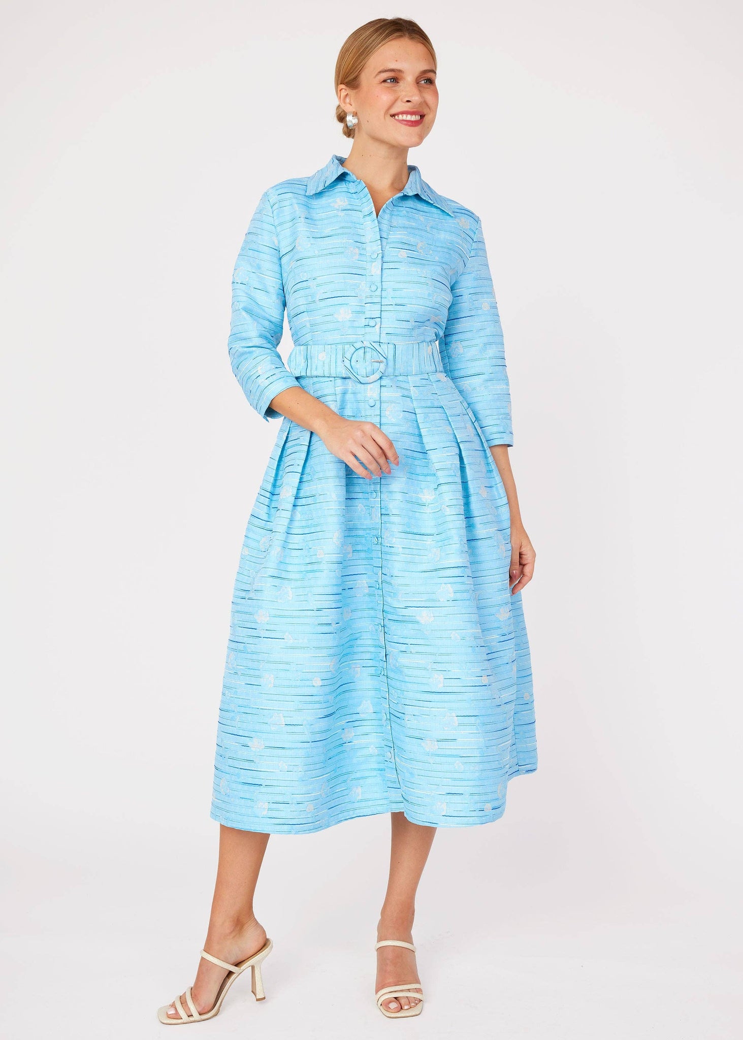 The Cecilia Midi Dress in Blue Textured Dupioni from Abbey Glass is a testament to effortless elegance. It's designed for the woman who appreciates the art of dressing up, valuing both style and comfort. This dress embodies the brand's ethos of promoting self-assured femininity, adding a touch of playful elegance to your wardrobe. Expertly tailored, it offers an approachable yet functional option for every occasion. Enjoy the luxury of Abbey Glass and let your individual style shine.