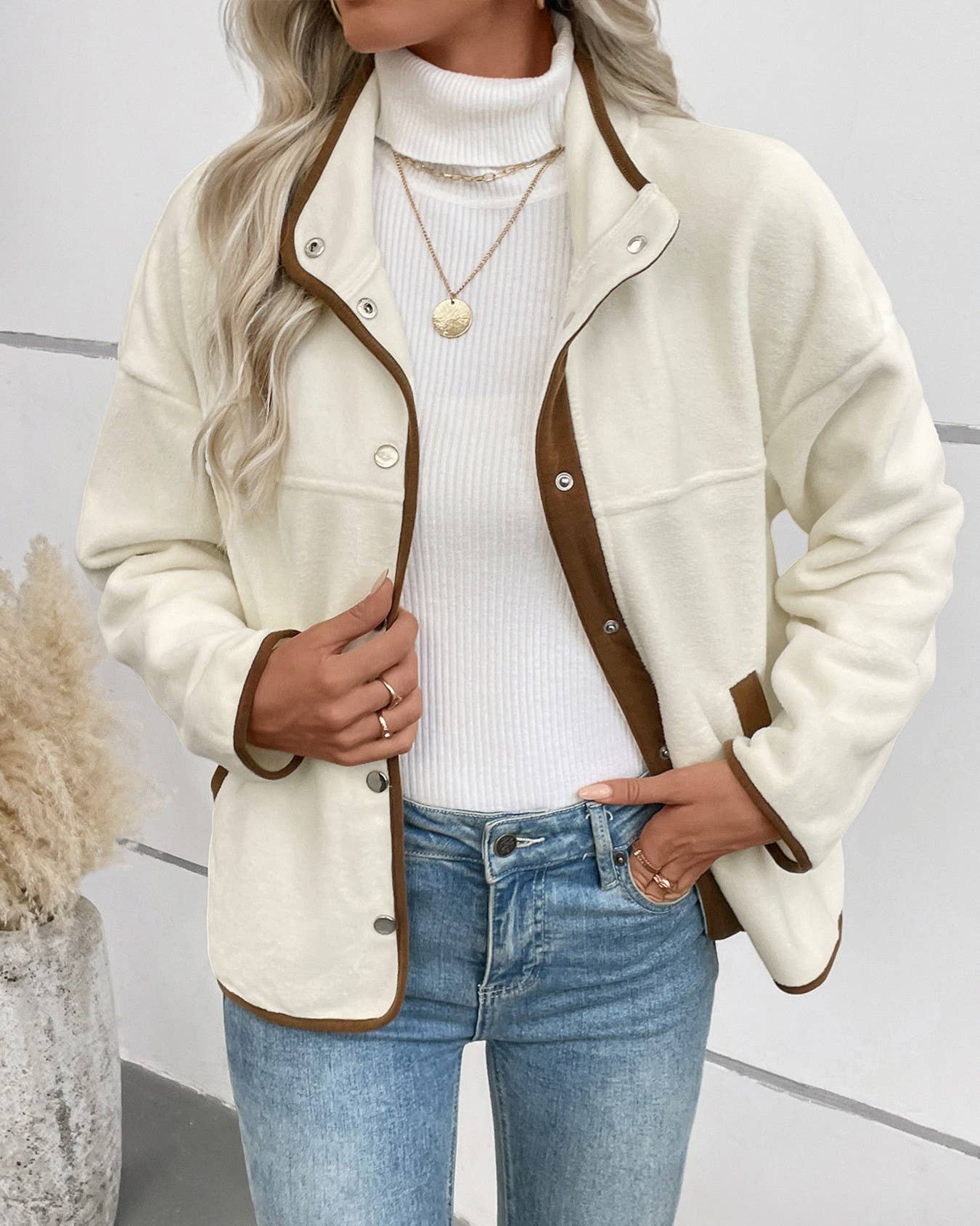 Contrast Color Polar Fleece Short Stand Collar Casual Jacket