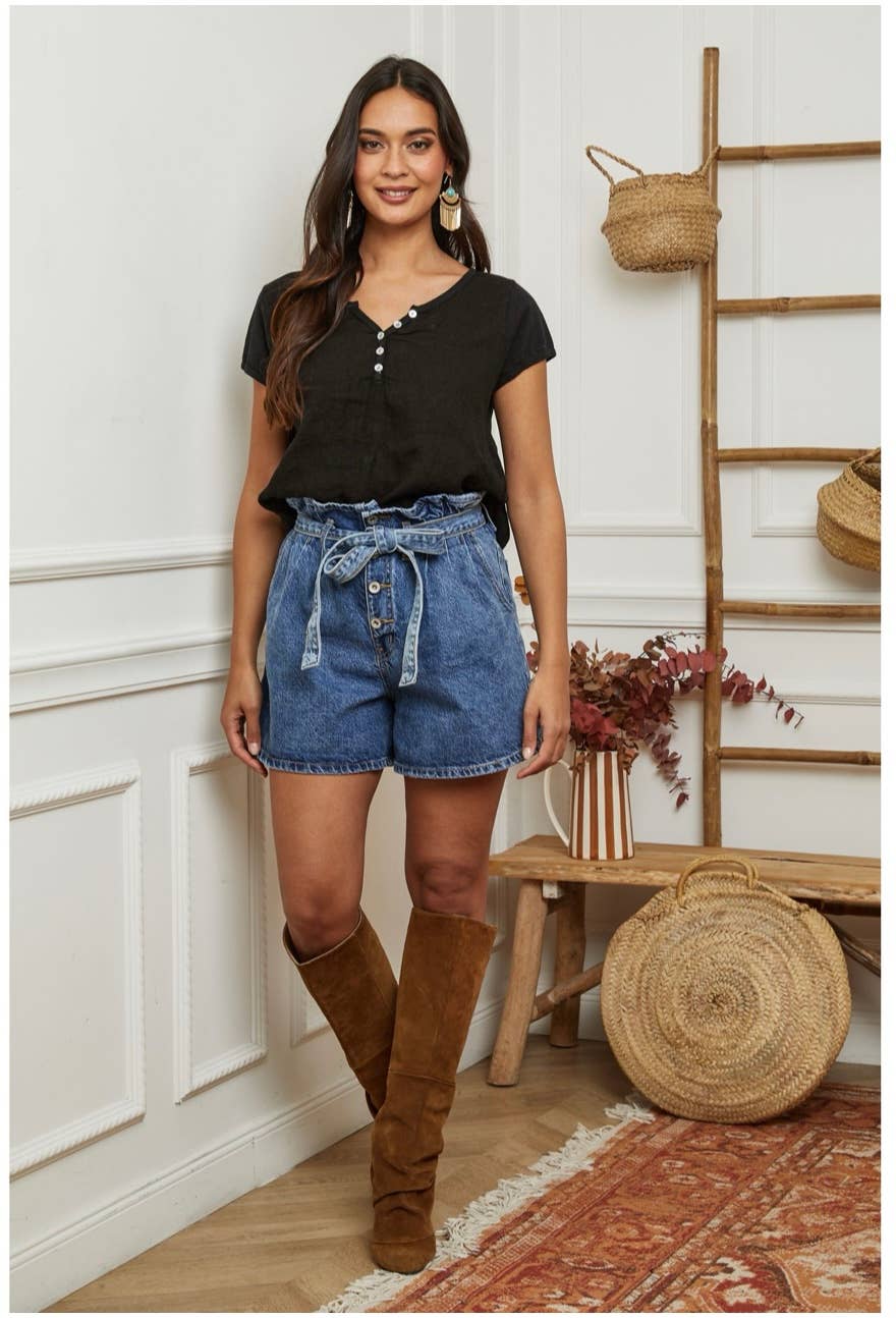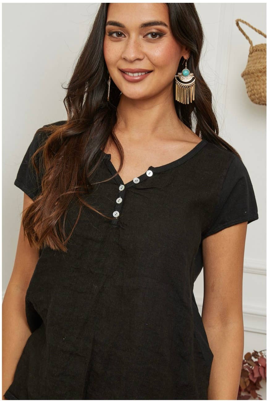 Round neck blouse with buttons for women in 100% linen front and back in 95% cotton and 5% elastane
